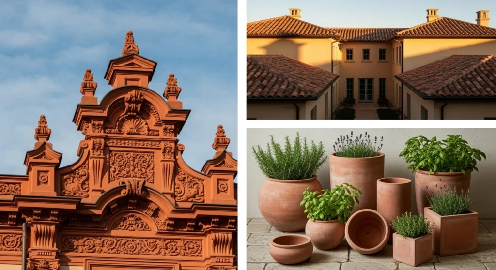 Collage featuring ornate terracotta architecture, clay roof tiles on Mediterranean-style buildings, and terracotta planters with green herbs.Repairing Terra Cotta Surfaces