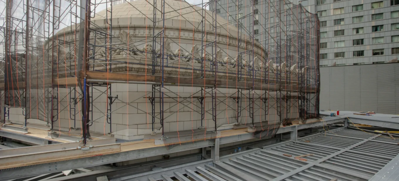 Installation of structural steel bracing to stabilize the existing parapet